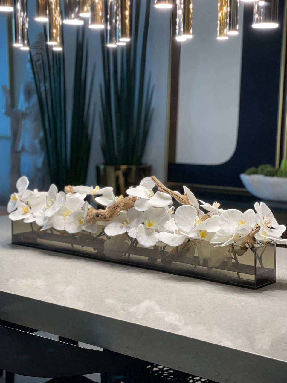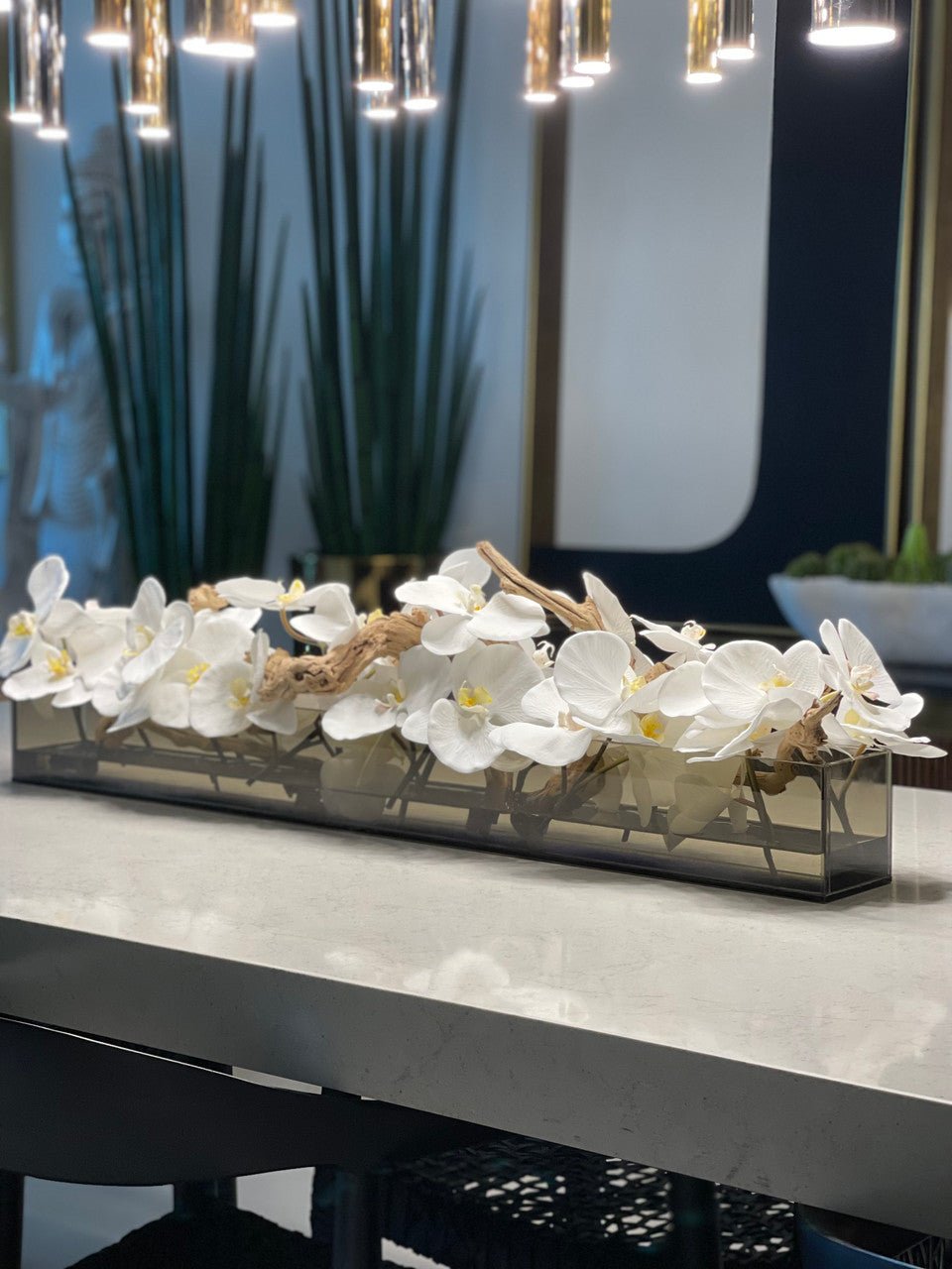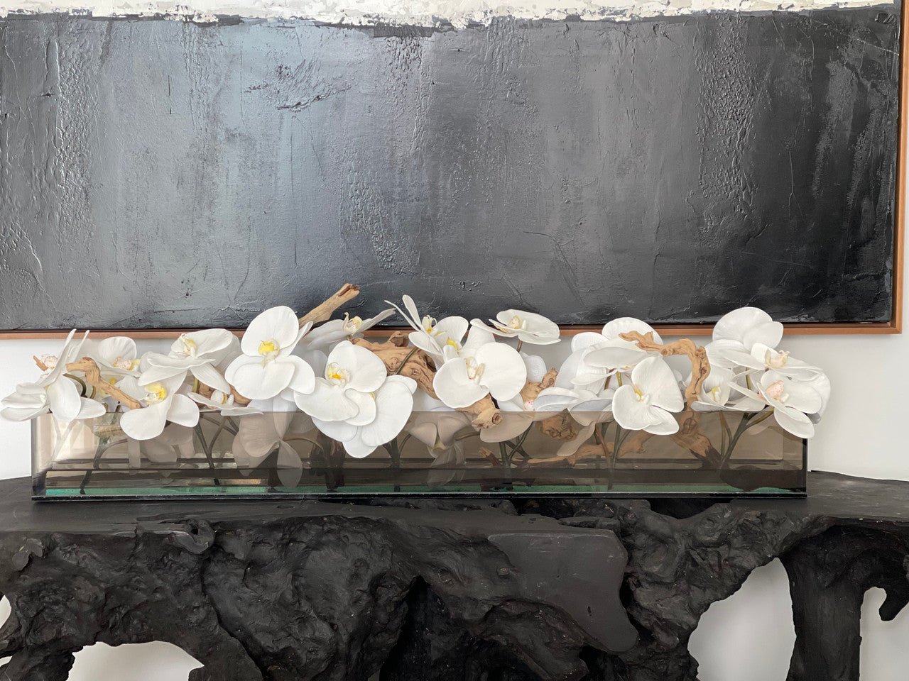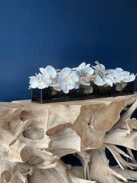 36″Casa Moderna tinted black glass planter with white Phalaenopsis orchids. sandblasted grape wood. white stones and our illusion water.The stunning sight of a Phalaenopsis orchids in full bloom is nothing less than breathtaking. Their huge. curving petals; double rows of gorgeous blooms march along our casa moderna glass plate planter. This translucent modern glass planter features 90 degree angles and a modern linear design.The sight of a massed display of Phalaenopsis orchids is so arresting that we have paired it with natural sandblastedgrape woodto achieve a beautifuland organic contrast.