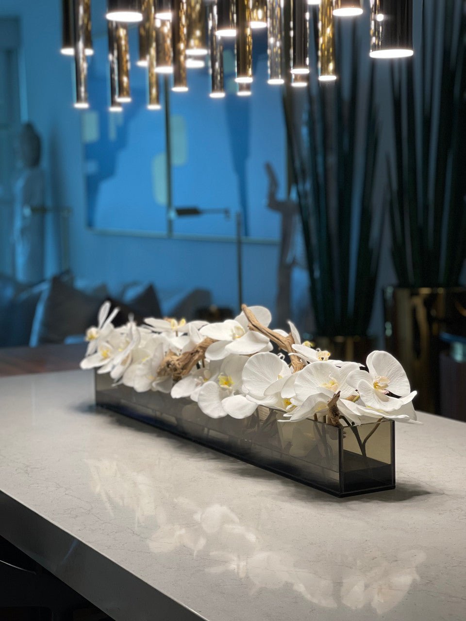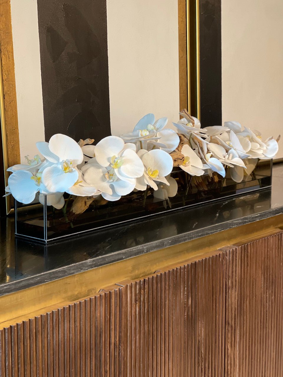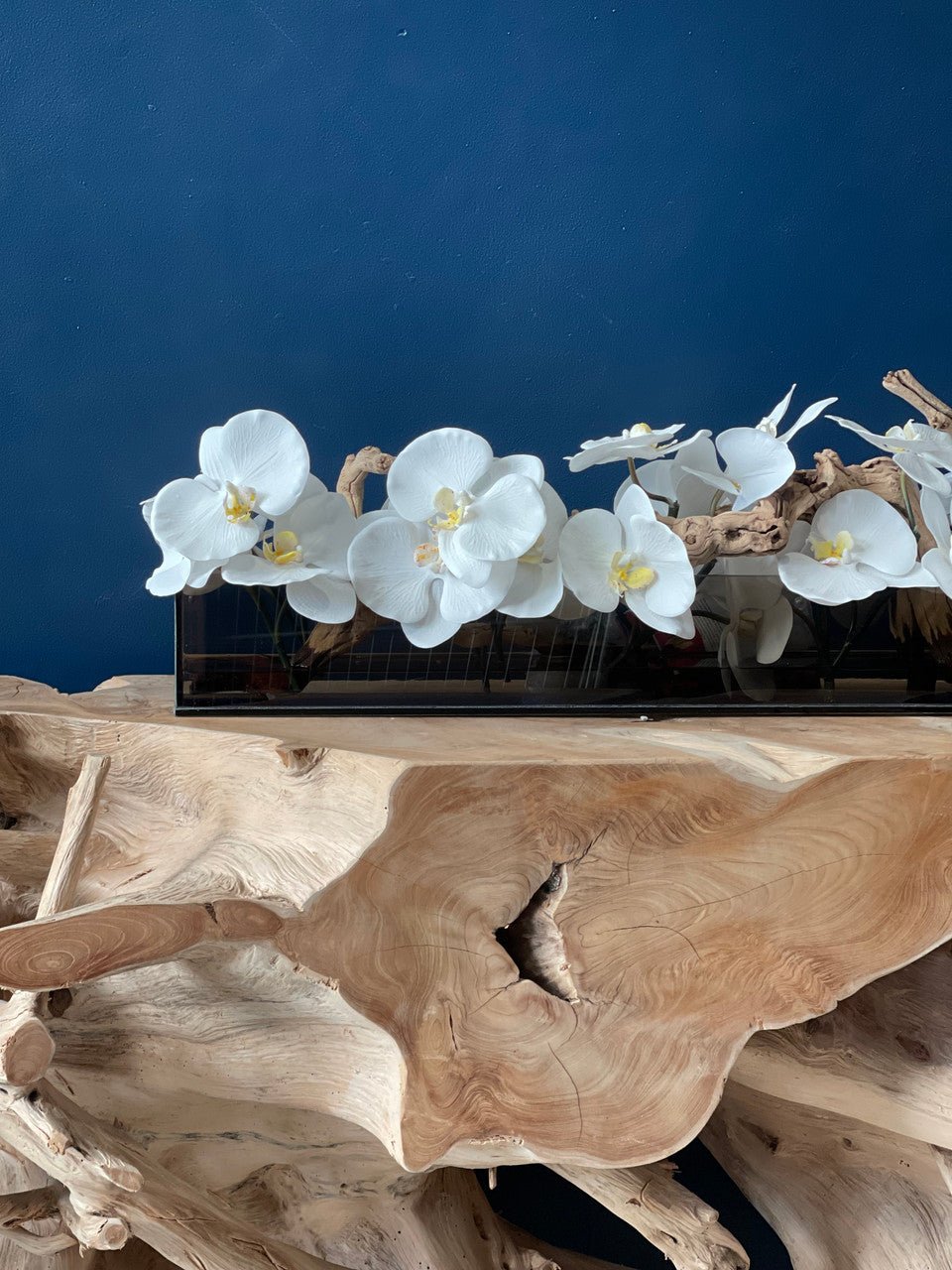 36″Casa Moderna tinted black glass planter with white Phalaenopsis orchids. sandblasted grape wood. white stones and our illusion water.The stunning sight of a Phalaenopsis orchids in full bloom is nothing less than breathtaking. Their huge. curving petals; double rows of gorgeous blooms march along our casa moderna glass plate planter. This translucent modern glass planter features 90 degree angles and a modern linear design.The sight of a massed display of Phalaenopsis orchids is so arresting that we have paired it with natural sandblastedgrape woodto achieve a beautifuland organic contrast.