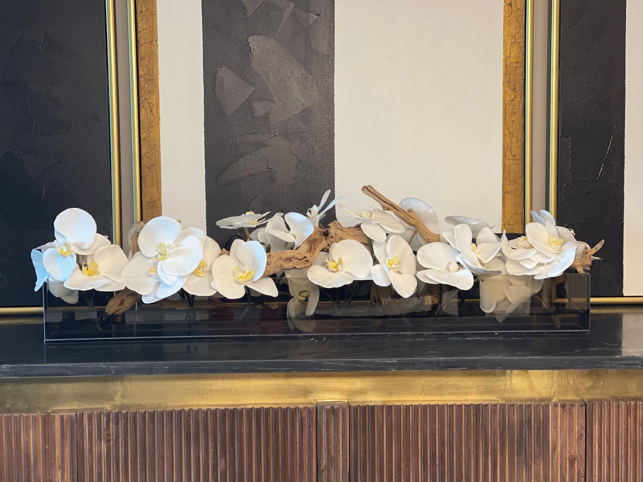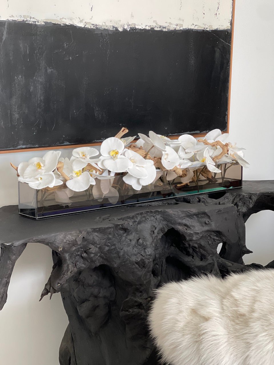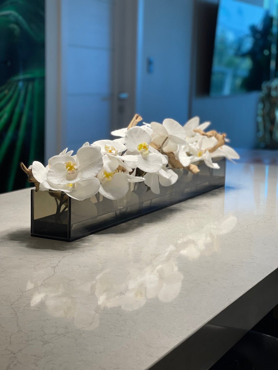 Be the first to review “36″ Casa Moderna Black Tinted Glass Plate Planter with white Phalaenopsis orchids”