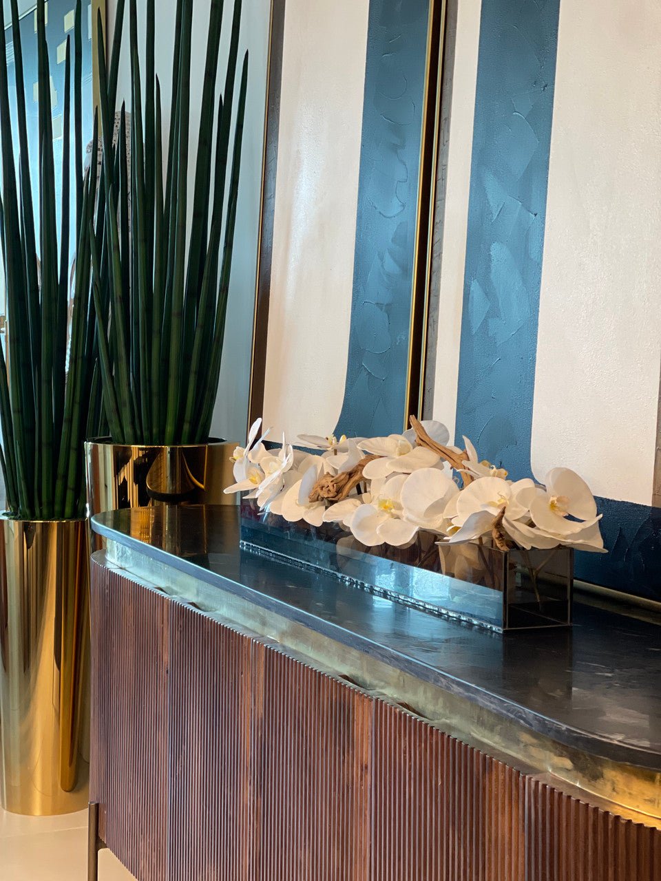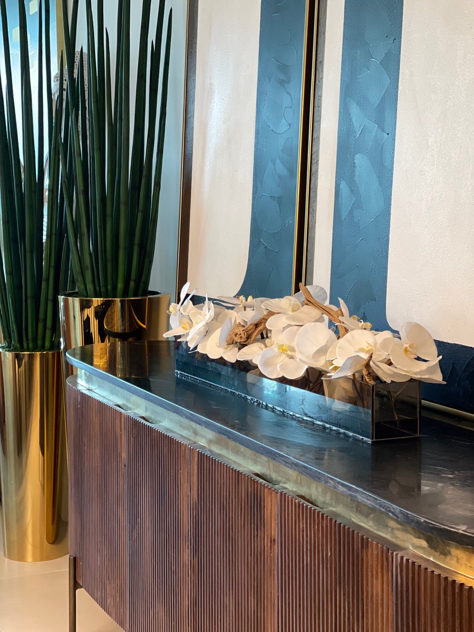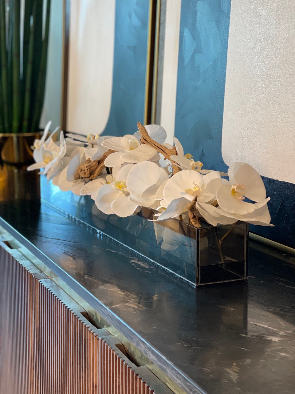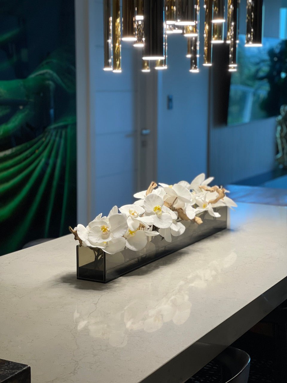 Be the first to review “36″ Casa Moderna Black Tinted Glass Plate Planter with white Phalaenopsis orchids”
