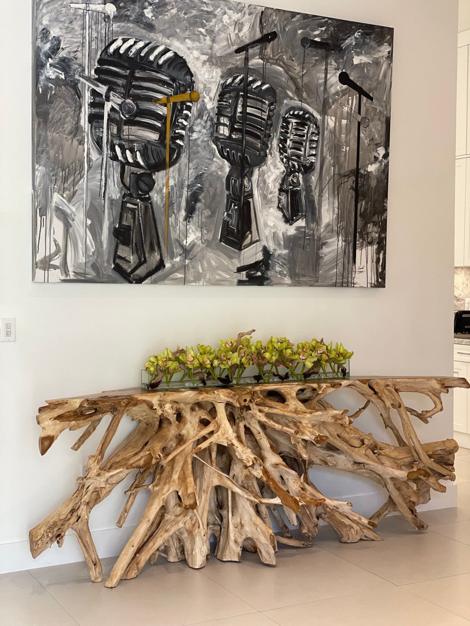 48″ Casa Moderna glass plate planter with multiple stems of green Cymbidium orchids. sand blasted grapewood and white stones anchored in our illusion water