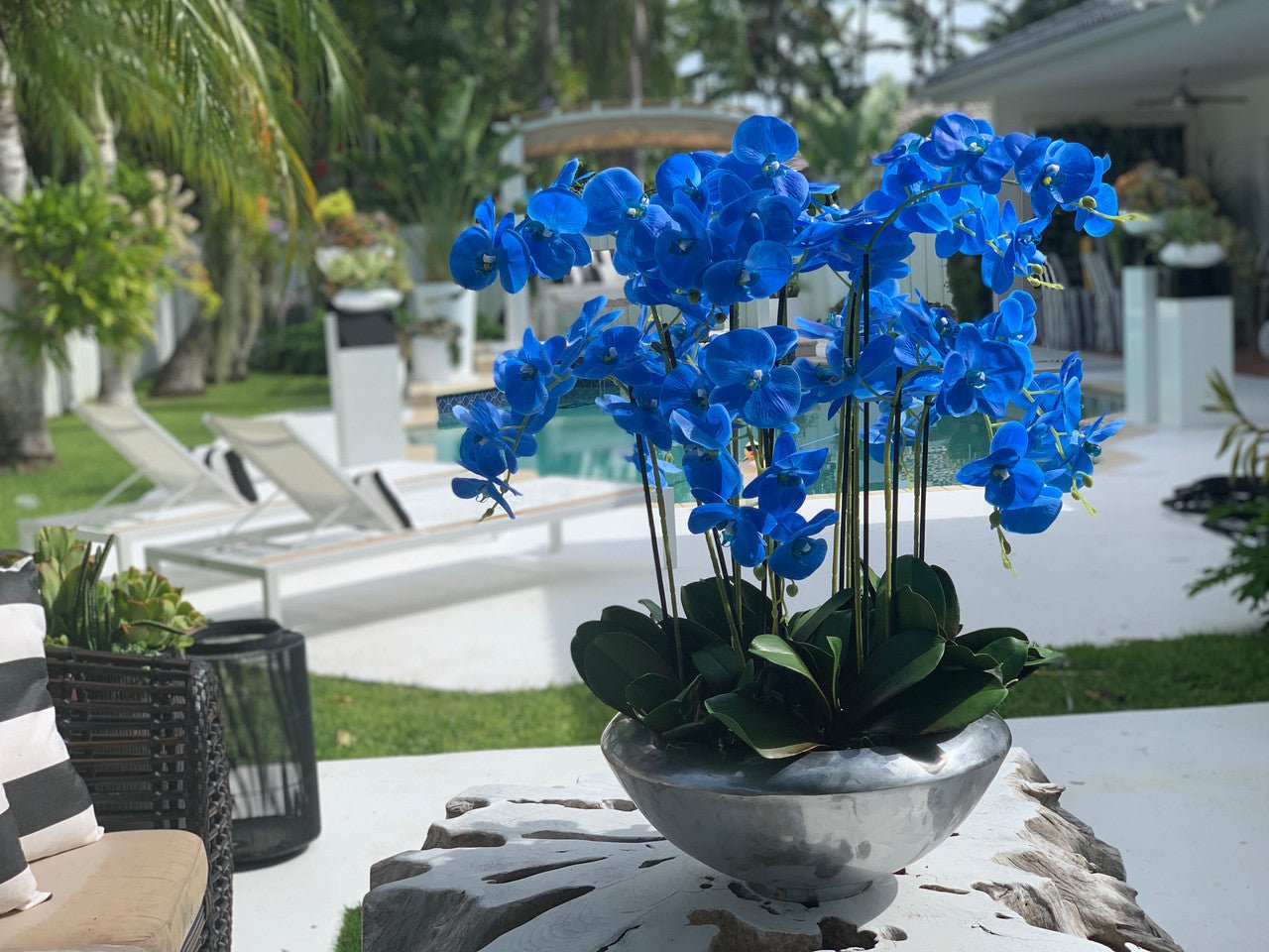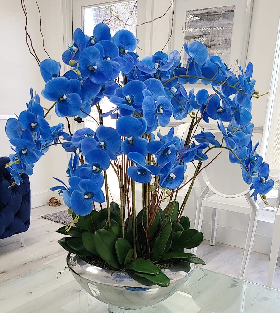 Graceful and exotic. the phalaenopsisorchid has symbolized integrity. nobility. and luxury for centuries. Our enduring. blue phalaenopsis arrangement captures the artistry and spirit of natural orchids. It’s prized for its profusion of perfect blooms. Vertical bamboo stakes. broad green leaves. and a genuine moss base add to the realism of this arrangement.Often called the moth orchid. the phalaenopsis is a favorite among our designers for its dense leaves. elegantly arching sprays and lovely blooms. Our remarkably lifelike arrangement is staked into a moss-covered silver avenue bowl for a timeless. authentic look that will endure for years to come. This arrangement is just the right size and is versatile enough to use as a coffee table centerpiece. a dining room or console table. It has a luscious tropical feel that will add vibrancy and elegance to any room.