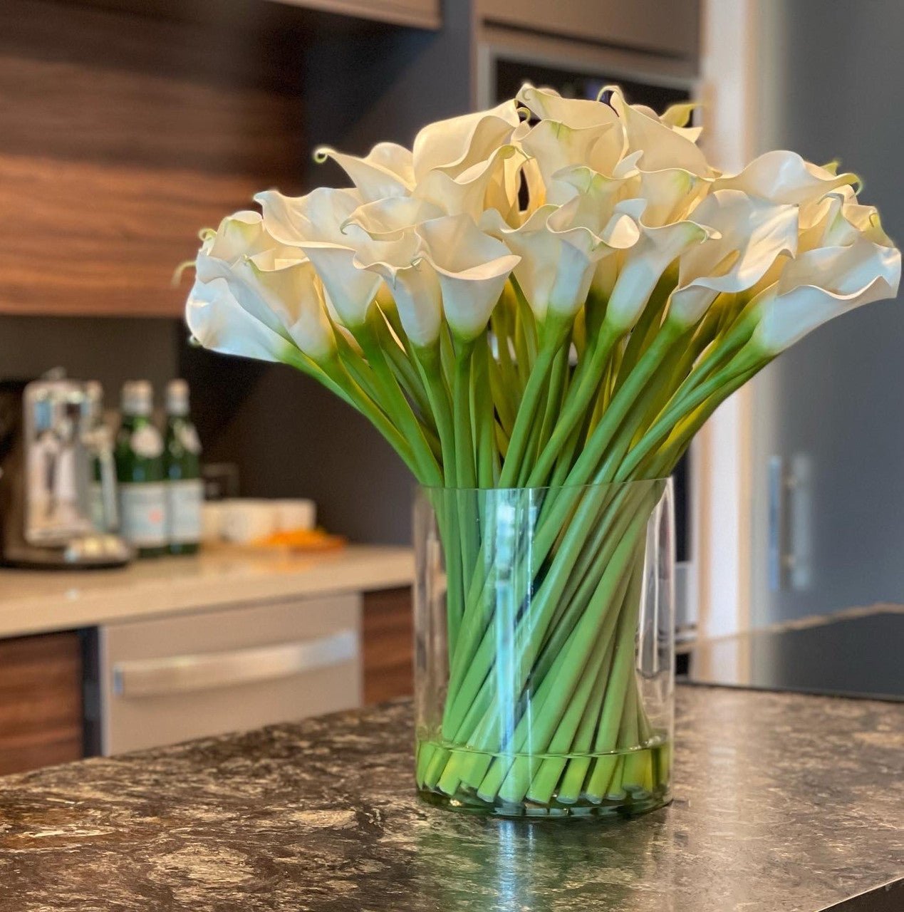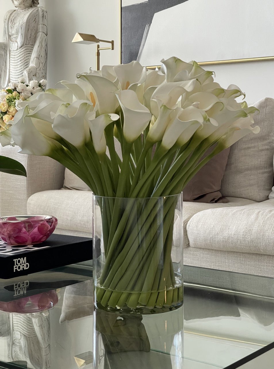 The beauty of fresh-cut flowers; the all-season staying power of faux. These calla lilies. in a beautiful glass vase. will look wonderful anywhere. whether you’re dressing a room in winter white or adorning your summer cottage with coastal colors. Each blossom is hand-placed by artisans and rendered in incredibly realistic detail.